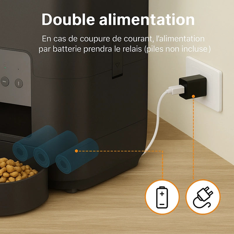 pas de soucis ! se distributeur a croquette possède une alimentation par batterie celle-ci prendras le relais (pile non incluse lors de l'achat)