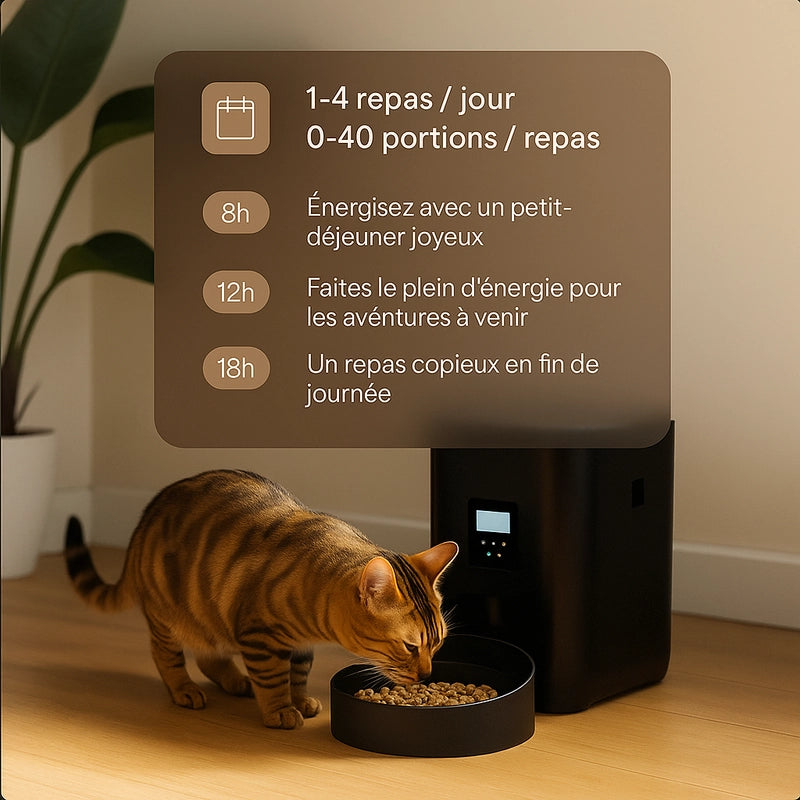 Ne vous souciez plus de l'heure des repas. Planifiez tout depuis votre téléphone, où que vous soyez. Votre animal est nourri, vous êtes serein.